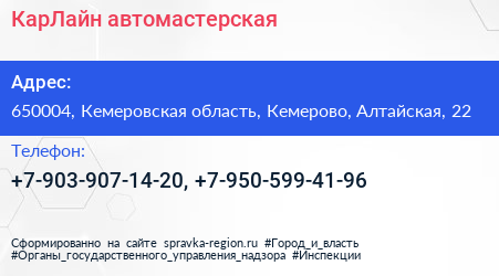 КарЛайн, автомастерская по адресу 650004, Кемеровская область, Кемерово, Алтайская, 22 в дальнейшем Организация, размещена в следующих категориях: