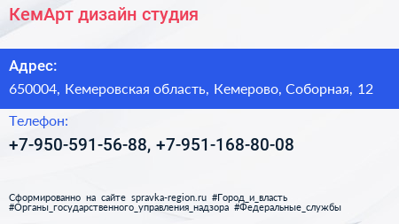 КемАрт, дизайн-студия по адресу 650004, Кемеровская область, Кемерово, Соборная, 12 в дальнейшем Организация, размещена в следующих категориях: