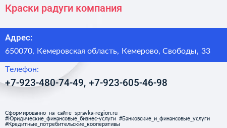 Краски радуги, компания по адресу 650070, Кемеровская область, Кемерово, Свободы, 33 в дальнейшем Организация, размещена в следующих категориях: