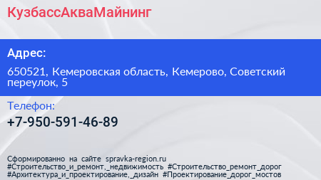 КузбассАкваМайнинг по адресу 650521, Кемеровская область, Кемерово, Советский переулок, 5 в дальнейшем Организация, размещена в следующих категориях: