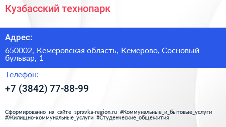 Кузбасский технопарк по адресу 650002, Кемеровская область, Кемерово, Сосновый бульвар, 1 в дальнейшем Организация, размещена в следующих категориях: