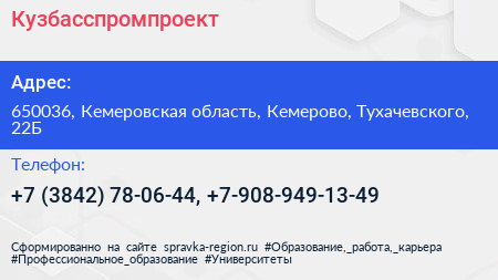 Кузбасспромпроект по адресу 650036, Кемеровская область, Кемерово, Тухачевского, 22Б в дальнейшем Организация, размещена в следующих категориях: