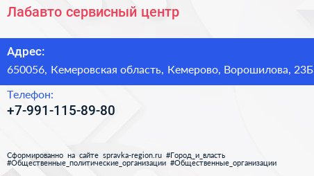 Лабавто, сервисный центр по адресу 650056, Кемеровская область, Кемерово, Ворошилова, 23Б в дальнейшем Организация, размещена в следующих категориях: