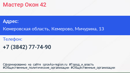 Мастер Окон 42 по адресу Кемеровская область, Кемерово, Мичурина, 13 в дальнейшем Организация, размещена в следующих категориях: