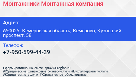 Монтажники, Монтажная компания по адресу 650025, Кемеровская область, Кемерово, Кузнецкий проспект, 58 в дальнейшем Организация, размещена в следующих категориях: