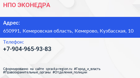 НПО ЭКОНЕДРА по адресу 650991, Кемеровская область, Кемерово, Кузбасская, 10 в дальнейшем Организация, размещена в следующих категориях: