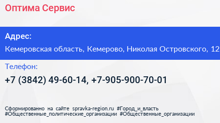 Оптима-Сервис по адресу Кемеровская область, Кемерово, Николая Островского, 12 в дальнейшем Организация, размещена в следующих категориях: