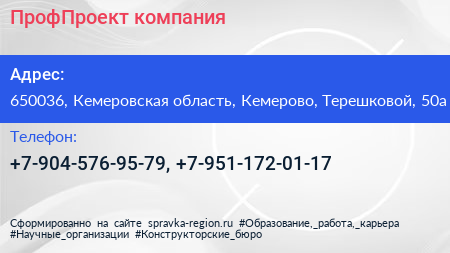 ПрофПроект, компания по адресу 650036, Кемеровская область, Кемерово, Терешковой, 50а в дальнейшем Организация, размещена в следующих категориях: