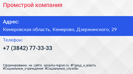 Промстрой, компания по адресу Кемеровская область, Кемерово, Дзержинского, 29 в дальнейшем Организация, размещена в следующих категориях: