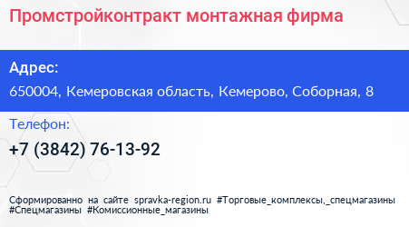 Промстройконтракт, монтажная фирма по адресу 650004, Кемеровская область, Кемерово, Соборная, 8 в дальнейшем Организация, размещена в следующих категориях: