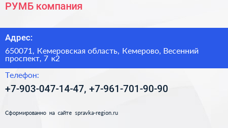 РУМБ, компания по адресу 650071, Кемеровская область, Кемерово, Весенний проспект, 7 к2 в дальнейшем Организация, размещена в следующих категориях: