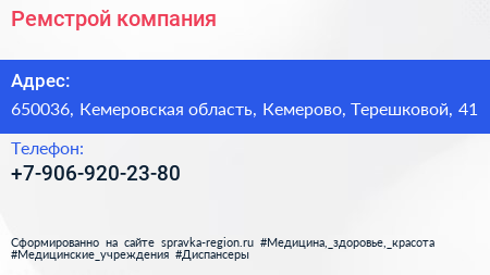 Ремстрой, компания по адресу 650036, Кемеровская область, Кемерово, Терешковой, 41 в дальнейшем Организация, размещена в следующих категориях: