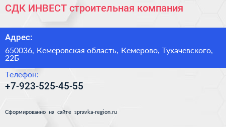 СДК-ИНВЕСТ, строительная компания по адресу 650036, Кемеровская область, Кемерово, Тухачевского, 22Б в дальнейшем Организация, размещена в следующих категориях: