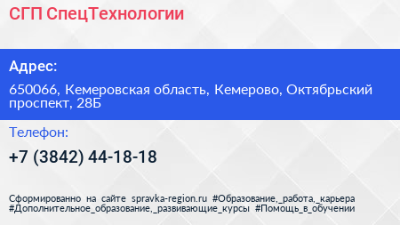 СГП-СпецТехнологии по адресу 650066, Кемеровская область, Кемерово, Октябрьский проспект, 28Б в дальнейшем Организация, размещена в следующих категориях: