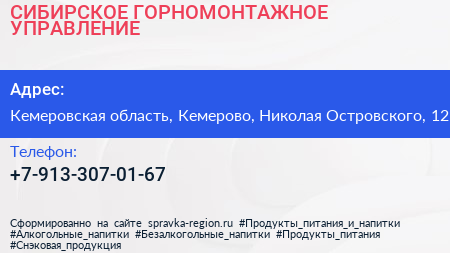 СИБИРСКОЕ ГОРНОМОНТАЖНОЕ УПРАВЛЕНИЕ по адресу Кемеровская область, Кемерово, Николая Островского, 12 в дальнейшем Организация, размещена в следующих категориях: