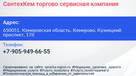 СантехКем, торгово-сервисная компания по адресу 650051, Кемеровская область, Кемерово, Кузнецкий проспект, 176 в дальнейшем Организация, размещена в следующих категориях: