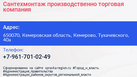 Сантехмонтаж, производственно-торговая компания по адресу 650070, Кемеровская область, Кемерово, Тухачевского, 40а в дальнейшем Организация, размещена в следующих категориях:
