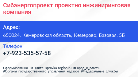 Сибэнергопроект, проектно-инжиниринговая компания по адресу 650024, Кемеровская область, Кемерово, Базовая, 5Б в дальнейшем Организация, размещена в следующих категориях: