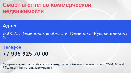 Смарт, агентство коммерческой недвижимости по адресу 650025, Кемеровская область, Кемерово, Рукавишникова, 3 в дальнейшем Организация, размещена в следующих категориях: