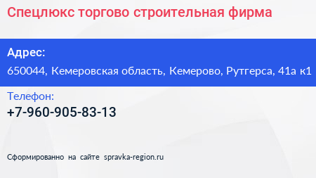 Спецлюкс, торгово-строительная фирма по адресу 650044, Кемеровская область, Кемерово, Рутгерса, 41а к1 в дальнейшем Организация, размещена в следующих категориях: