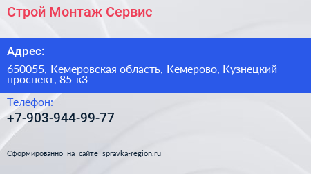 Строй Монтаж Сервис по адресу 650055, Кемеровская область, Кемерово, Кузнецкий проспект, 85 к3 в дальнейшем Организация, размещена в следующих категориях: