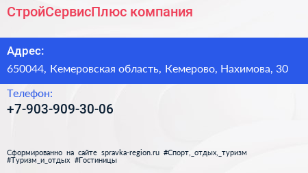 СтройСервисПлюс, компания по адресу 650044, Кемеровская область, Кемерово, Нахимова, 30 в дальнейшем Организация, размещена в следующих категориях: