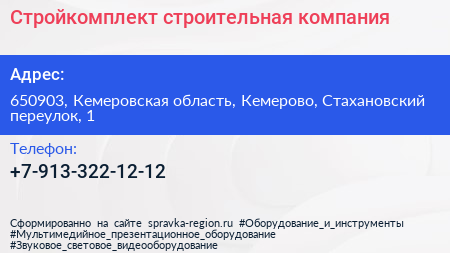 Стройкомплект, строительная компания по адресу 650903, Кемеровская область, Кемерово, Стахановский переулок, 1 в дальнейшем Организация, размещена в следующих категориях: