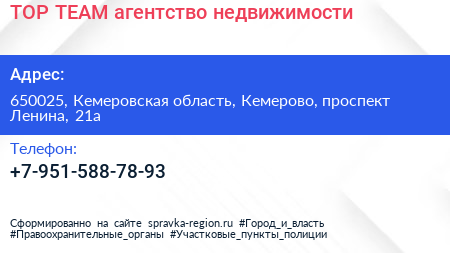 TOP-TEAM, агентство недвижимости по адресу 650025, Кемеровская область, Кемерово, проспект Ленина, 21а в дальнейшем Организация, размещена в следующих категориях:
