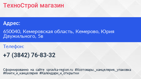 ТехноСтрой, магазин по адресу 650040, Кемеровская область, Кемерово, Юрия Двужильного, 5в в дальнейшем Организация, размещена в следующих категориях: