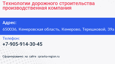 Технологии дорожного строительства, производственная компания по адресу 650036, Кемеровская область, Кемерово, Терешковой, 39а в дальнейшем Организация, размещена в следующих категориях: