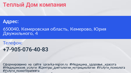 Теплый Дом, компания по адресу 650040, Кемеровская область, Кемерово, Юрия Двужильного, 4 в дальнейшем Организация, размещена в следующих категориях:
