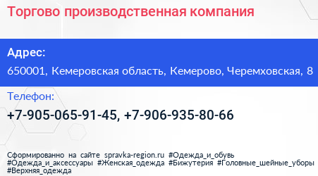 Торгово-производственная компания по адресу 650001, Кемеровская область, Кемерово, Черемховская, 8 в дальнейшем Организация, размещена в следующих категориях: