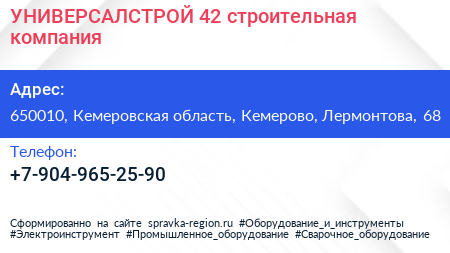 УНИВЕРСАЛСТРОЙ 42, строительная компания по адресу 650010, Кемеровская область, Кемерово, Лермонтова, 68 в дальнейшем Организация, размещена в следующих категориях: