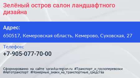Зелёный остров, салон ландшафтного дизайна по адресу 650517, Кемеровская область, Кемерово, Суховская, 27 в дальнейшем Организация, размещена в следующих категориях: