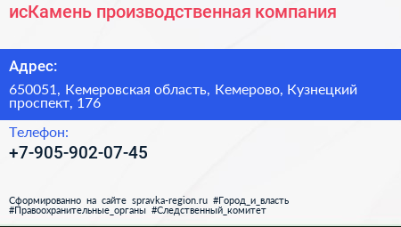 исКамень, производственная компания по адресу 650051, Кемеровская область, Кемерово, Кузнецкий проспект, 176 в дальнейшем Организация, размещена в следующих категориях: