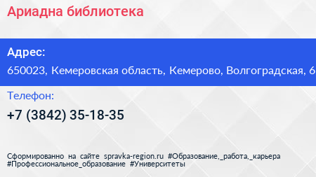 Ариадна, библиотека по адресу 650023, Кемеровская область, Кемерово, Волгоградская, 6 в дальнейшем Организация, размещена в следующих категориях:
