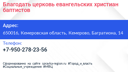 Благодать, церковь евангельских христиан-баптистов по адресу 650016, Кемеровская область, Кемерово, Багратиона, 14 в дальнейшем Организация, размещена в следующих категориях:
