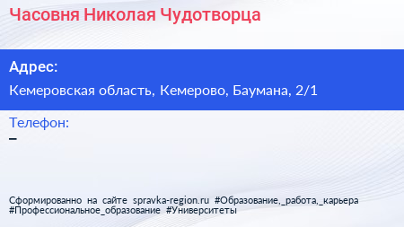 Часовня Николая Чудотворца по адресу Кемеровская область, Кемерово, Баумана, 2/1 в дальнейшем Организация, размещена в следующих категориях: