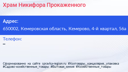 Храм Никифора Прокаженного по адресу 650002, Кемеровская область, Кемерово, 4-й квартал, 56а в дальнейшем Организация, размещена в следующих категориях: