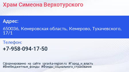 Храм Симеона Верхотурского по адресу 650036, Кемеровская область, Кемерово, Тухачевского, 17/1 в дальнейшем Организация, размещена в следующих категориях: