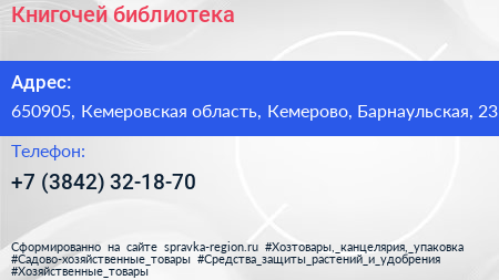 Книгочей, библиотека по адресу 650905, Кемеровская область, Кемерово, Барнаульская, 23 в дальнейшем Организация, размещена в следующих категориях: