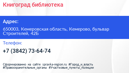 Книгоград, библиотека по адресу 650003, Кемеровская область, Кемерово, бульвар Строителей, 42Б в дальнейшем Организация, размещена в следующих категориях: