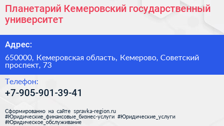 Планетарий, Кемеровский государственный университет по адресу 650000, Кемеровская область, Кемерово, Советский проспект, 73 в дальнейшем Организация, размещена в следующих категориях: