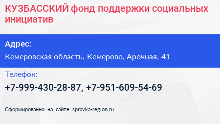 КУЗБАССКИЙ, фонд поддержки социальных инициатив по адресу Кемеровская область, Кемерово, Арочная, 41 в дальнейшем Организация, размещена в следующих категориях: