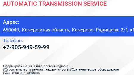 AUTOMATIC TRANSMISSION SERVICE по адресу 650040, Кемеровская область, Кемерово, Радищева, 2/1 к1 в дальнейшем Организация, размещена в следующих категориях: