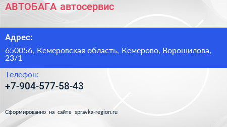 АВТОБАГА, автосервис по адресу 650056, Кемеровская область, Кемерово, Ворошилова, 23/1 в дальнейшем Организация, размещена в следующих категориях: