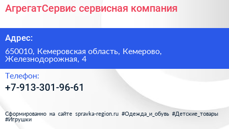 АгрегатСервис, сервисная компания по адресу 650010, Кемеровская область, Кемерово, Железнодорожная, 4 в дальнейшем Организация, размещена в следующих категориях: