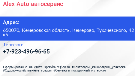 Alex Auto, автосервис по адресу 650070, Кемеровская область, Кемерово, Тухачевского, 42 к5 в дальнейшем Организация, размещена в следующих категориях: