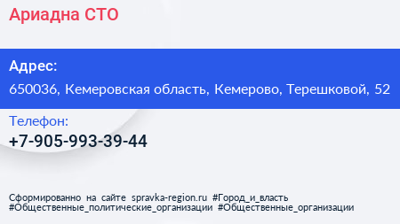 Ариадна, СТО по адресу 650036, Кемеровская область, Кемерово, Терешковой, 52 в дальнейшем Организация, размещена в следующих категориях: