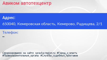 Авиком, автотехцентр по адресу 650040, Кемеровская область, Кемерово, Радищева, 2/1 в дальнейшем Организация, размещена в следующих категориях: